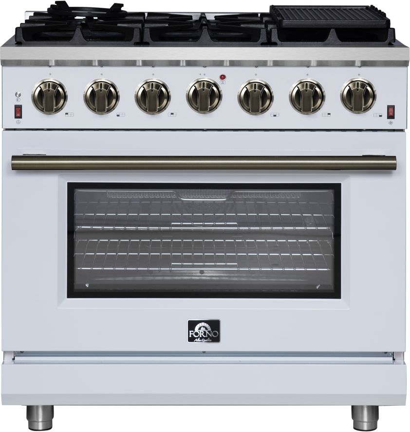 The Forno Massimo 36 Inch Gas Range in White harmonizes professional style and durability with Antique Brass. Its 6 sealed burners, totaling 83,000 BTU, include a precision 20,000 BTU dual-ring burner that can simmer at 1,000 BTU. Continuous cast iron grates ensure stability on the enamel surface.Read More