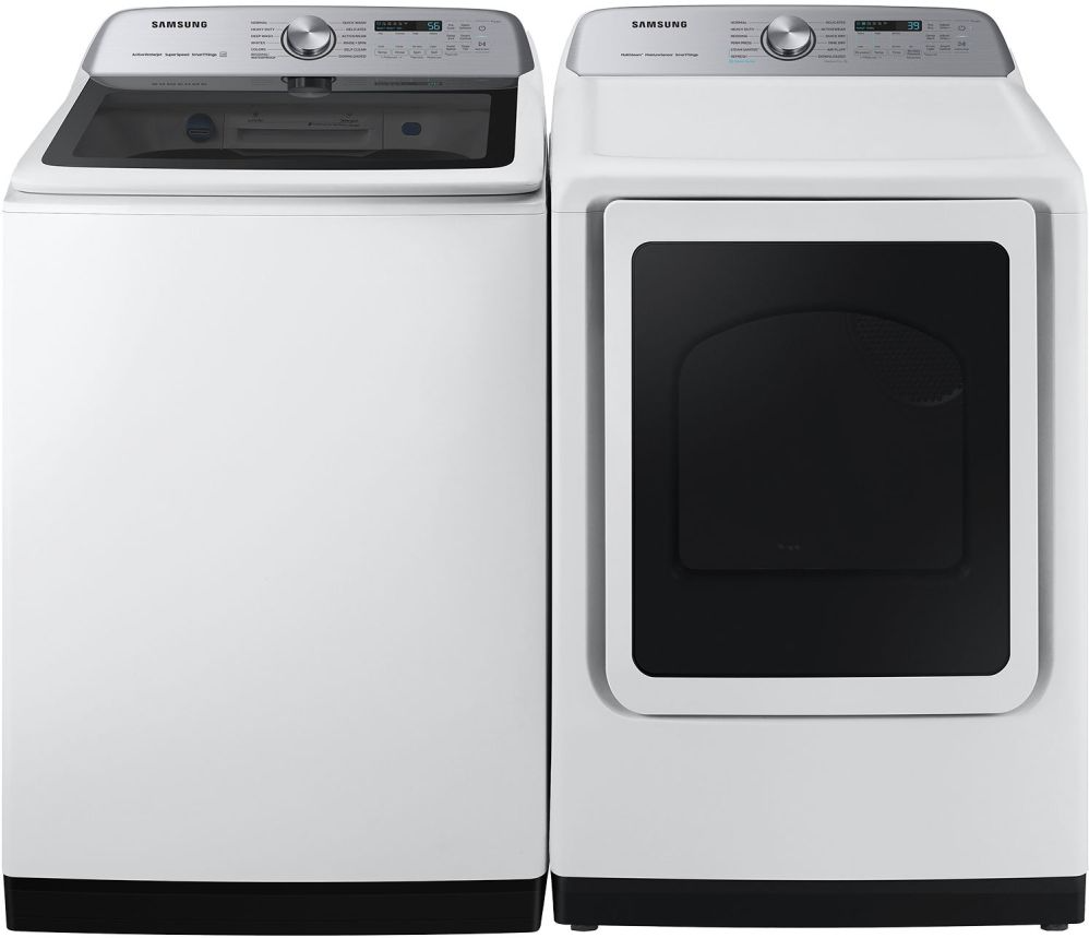 Samsung White Laundry Pair with a 5.1 cu. ft. capacity top load washer and a 7.4 cu. ft. capacity front load gas dryer.Read More